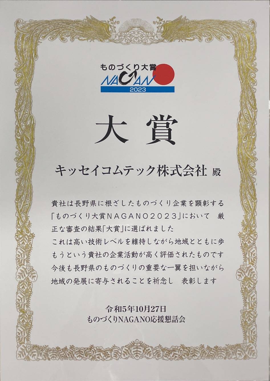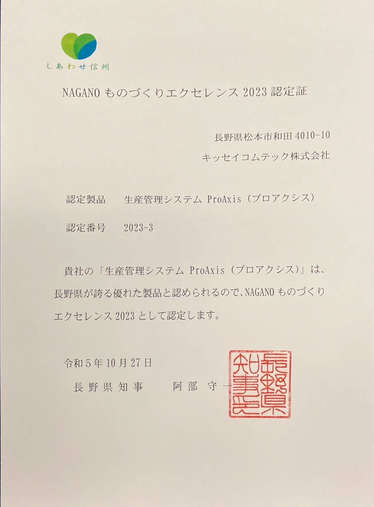 キッセイコムテック株式会社(本社:長野県松本市、代表取締役会長:神澤鋭二)は、ものづくり大賞NAGANO2023において大賞を受賞するとともに、生産管理システムProAxis(プロアクシス)がNAGANOものづくりエクセレンス2023として認定されました。