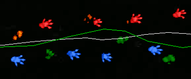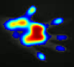 輝度を色のグラデーションで示すことで、足のつき方を分かり易く示します(上図はラットの例)。