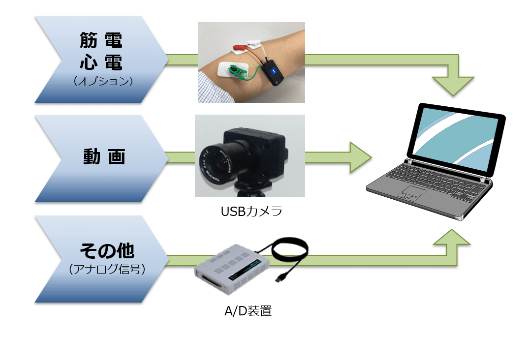 筋電図、心電図(オプション)、動画・アナログ信号(A/D変換装置が必要)の同時収録が可能です。