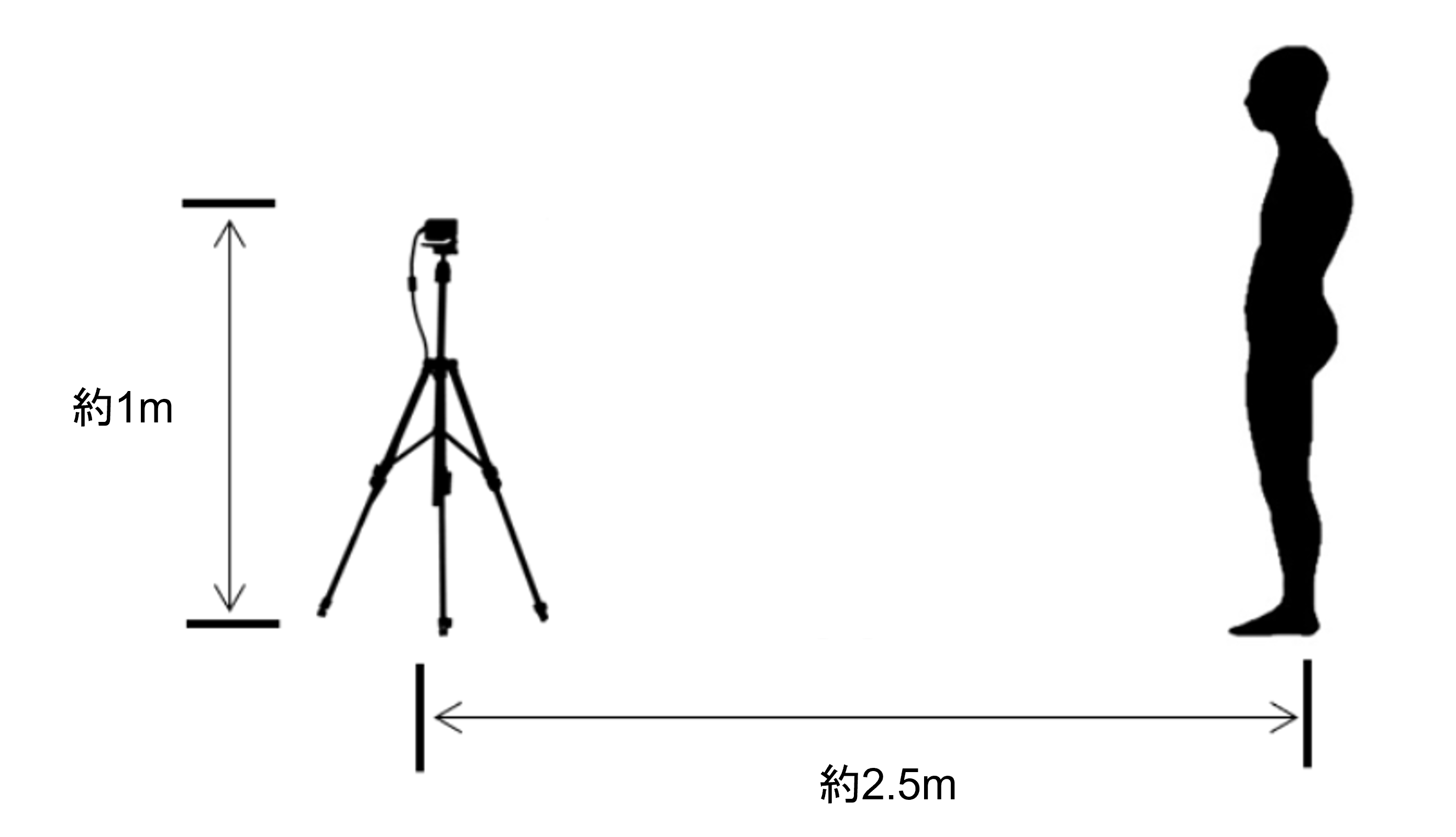 服装や計測環境によっては、カメラが人として認識せずに撮影ができない場合があります。また、マーカを用いない計測のため、想定しない結果が現われることがあります。