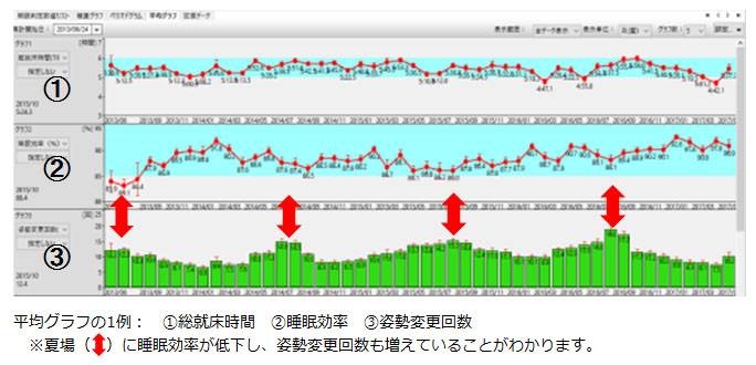 睡眠変数や歩数、寝姿勢などの平均値を求めグラフ表示します。睡眠の傾向がよりわかりやすくなります。