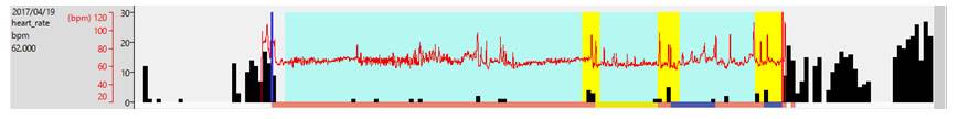 下図は、睡眠中の心拍数の変化を睡眠判定、活動量と重ねた例です。