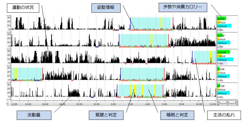 - 睡眠判定結果や活動量を積算することで、睡眠や活動のパターンをグラフ化できます。