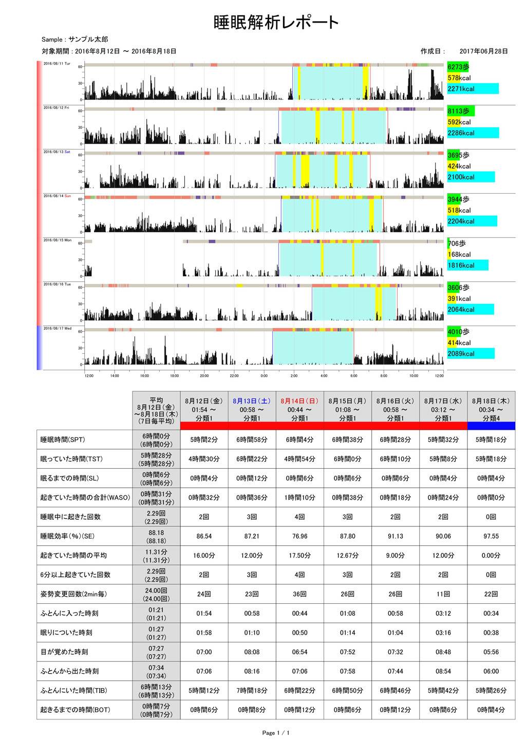 睡眠時間、睡眠潜時などの睡眠変数と計測データをレポートにして出力できます。