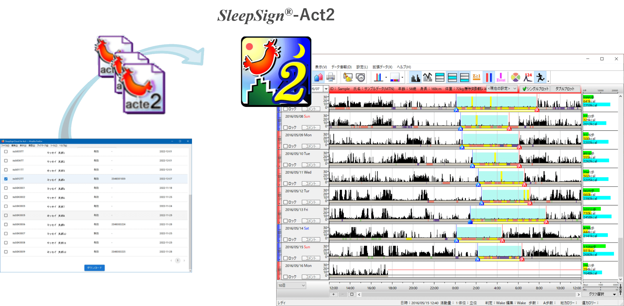 Webブラウザからデータファイル(.acte2)がダウンロードでき、 SleepSign®-Actにインポートできます。 |