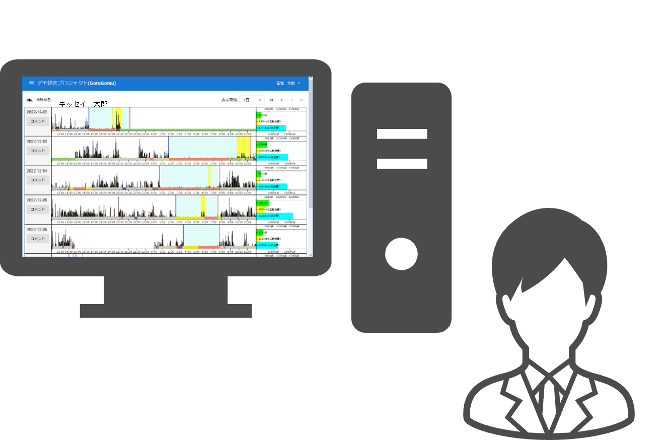 毎日被験者がアプリからデータを読み取ることで、研究者はWebブラウザで装着状況の確認できます。 |