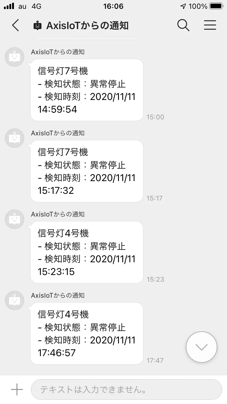 設備の稼働に異常があったり停止したりすると、設備名称と稼働停止時間などの詳細情報、現在の設備の状態が記されたメッセージがBotを介してLINE WORKSから通知される仕組みです。これによって、設備の異常通知を速やかにスマホで受け取れるので、常にPCを監視する必要がありませんし、工場内に人員を常駐させる必要もなくなります。