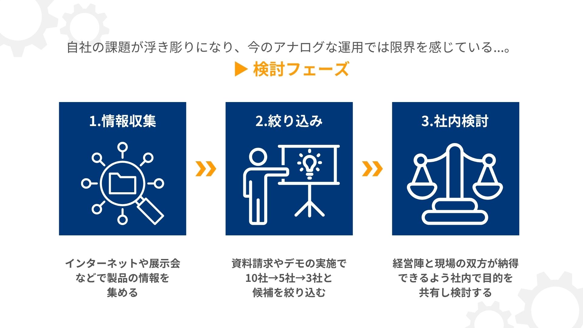 検討フェーズ:さまざまな製品の情報をかき集め、自社に適していそうなシステムをある程度の数まで絞るフェーズ。資料請求やデモの実施によって、業務フローとの相性およびベンダーの支援体制などを確認し、社内で検討を重ねていきましょう。