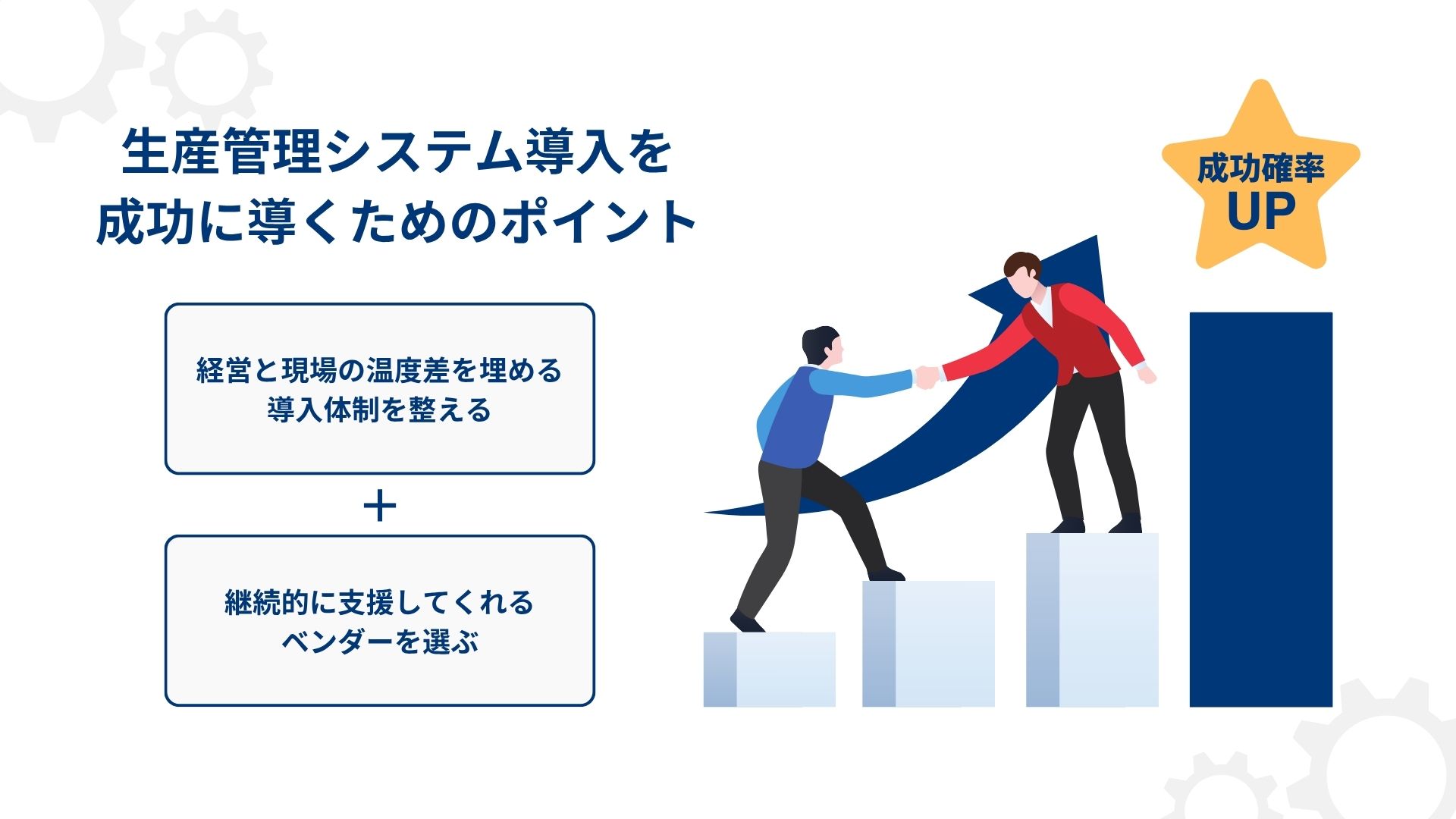 経営層と現場との温度差を埋めつつ、伴走支援のあるベンダーとの関係を築きながら生産管理システムを導入していくことが、成功のためのカギとなります。