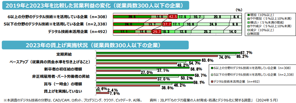 実際に「ものづくり白書」の調査によると、デジタル化を進めた企業のほうが営業利益を伸ばした割合が高いという結果が出ています。そして、特に注目すべき点は、営業利益が向上した企業は「従業員の処遇を改善している」ということです。