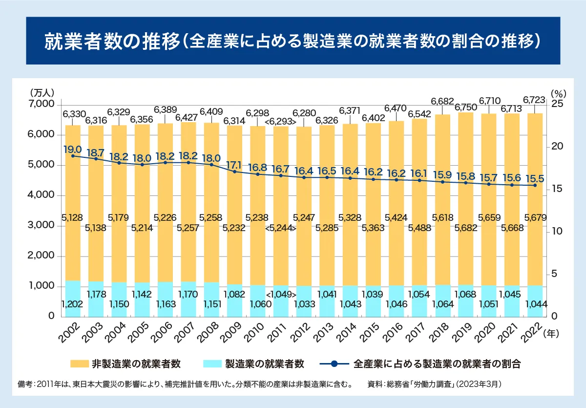 経済産業省の「2023年版ものづくり白書」によると、製造業の就業者数は2022年時点で1,044万人と2002年時点よりも約160万人減少しました。全産業の就業者数が微増しているのに対して、製造業の就業者数は減少傾向にあることがうかがえます。全産業に対する製造業従事者の割合を見ると、2002年時点では約2割(19%)を占めていましたが、2022年時点では15.5%と、3.5ポイントの減少となっています。