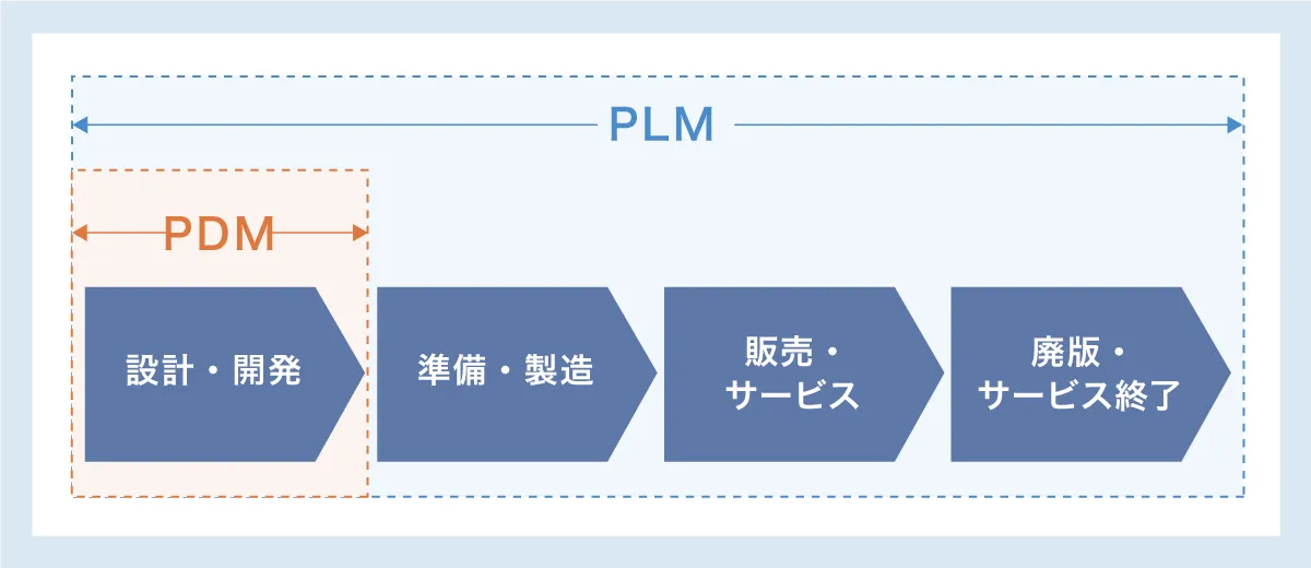 「製品設計」の領域を対象に使われるPDMに対して、「製品開発〜製造〜販売」と受注から納品までをカバーするシステムをPLMと言います。つまり、PLMは製品ライフサイクルに関する情報を一元管理するためのシステムと言えるでしょう。PDMはPLMの領域の一部分を対象とし、開発段階のデータを管理することに特化しています。