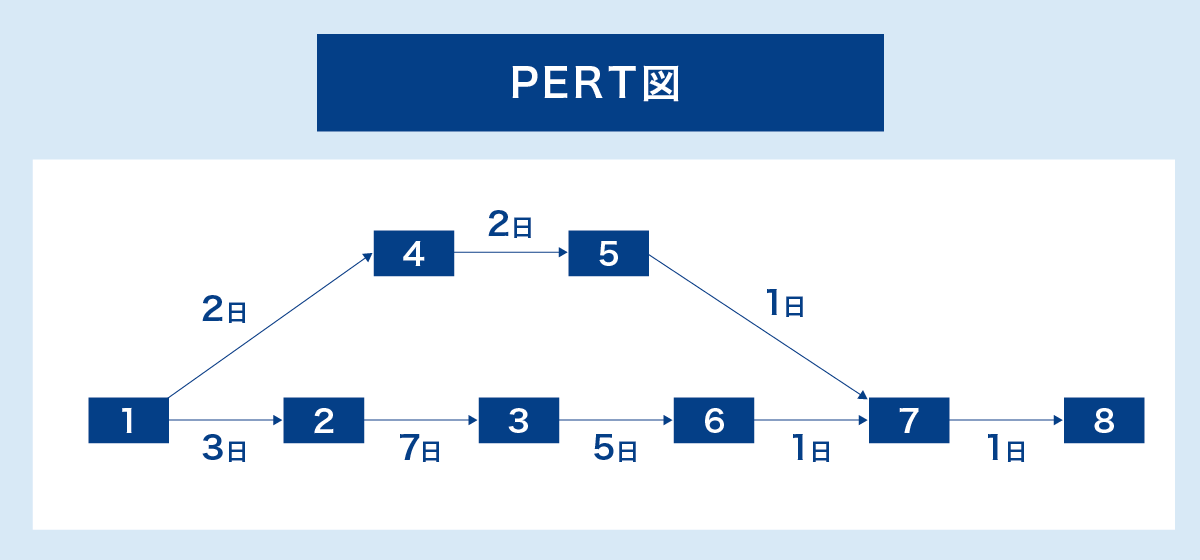 プロジェクトに関連する各工程の所要期間に加え、タスクの依存関係を図式にして見える化したものがPERT図です。業務全体の関係性を把握しやすく、工程の多い大規模なプロジェクトなども整理しやすいでしょう。