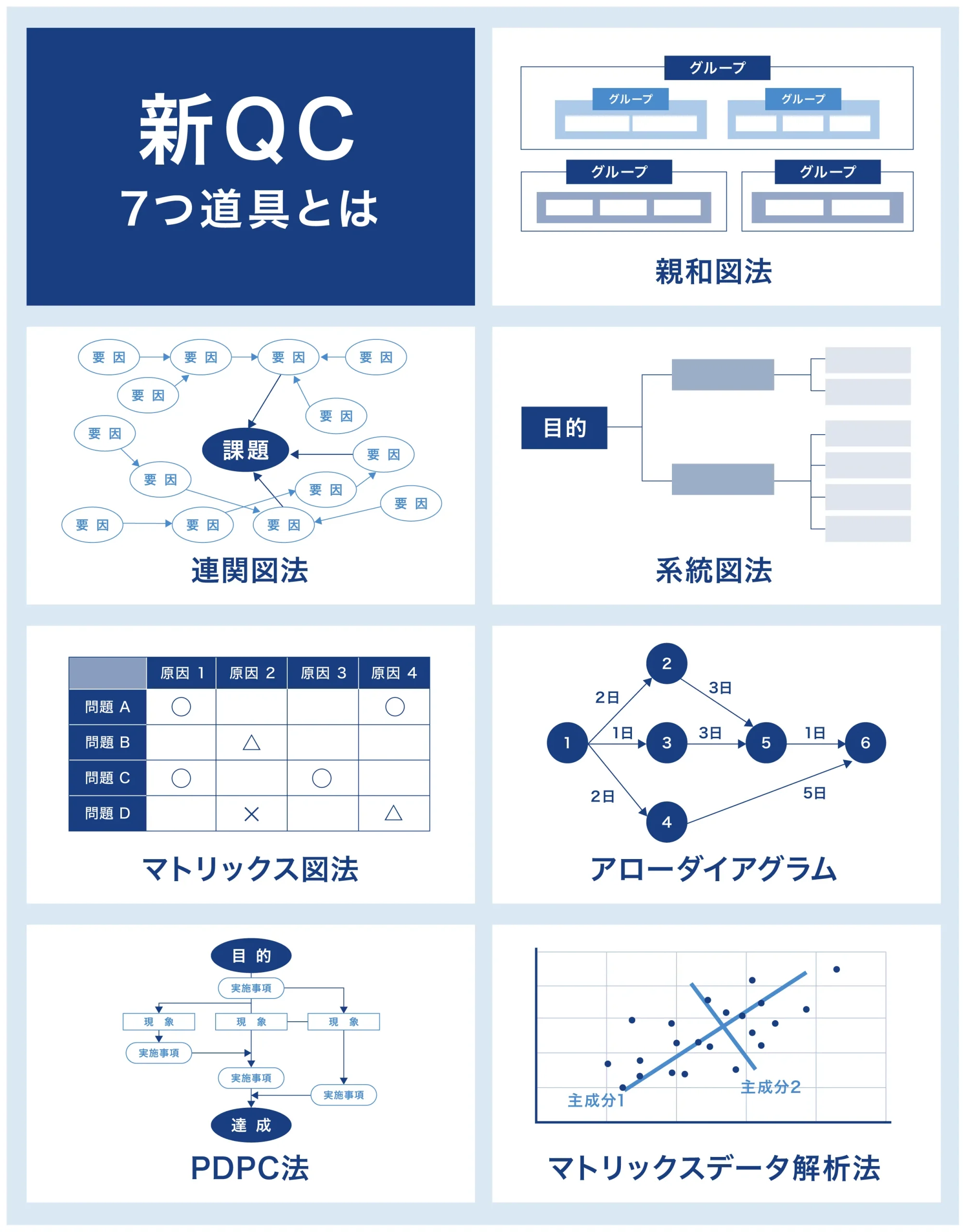 製造業の工程において、全てが数値として表れるとは限らず、データとして扱えない場合、QC7つ道具は使えません。そこで登場するのが、新QC7つ道具(New Quality Control Seven Tools、略称:N7)です。数値化できないデータを集計し、品質管理を定性的に分析し改善・解決するために用いられる手法です。
