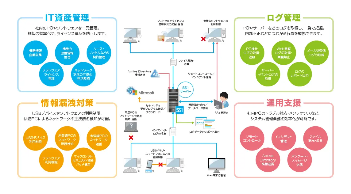 また、万全のセキュリティ設定が搭載されているので、管理者以外へのIT資産の情報漏洩を防止します。