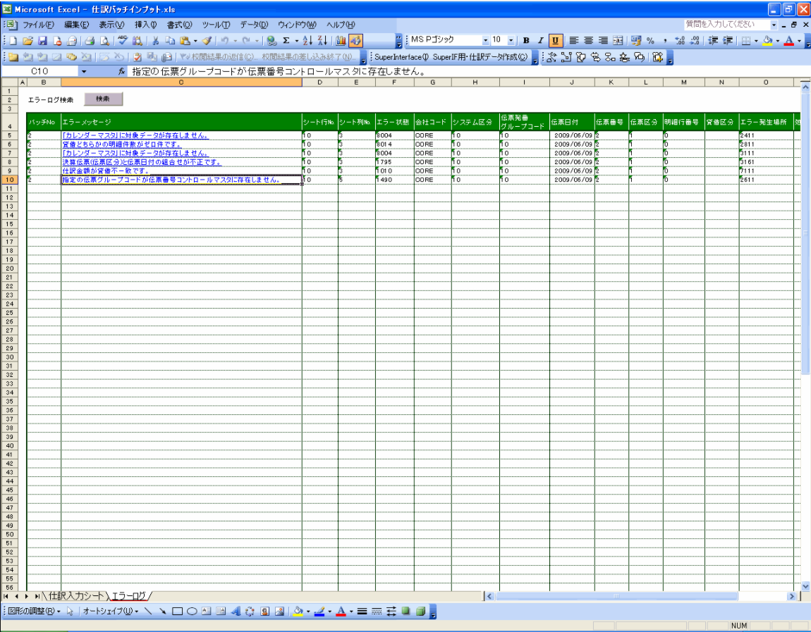 • エラーは別シートに詳細表示します。クリックでエラー箇所に遷移でき、大量仕訳の修正も容易です。