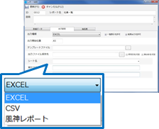 出力形式はExcel、CSVの他、アイ・コン社の「風神レポート」と連携することで、より多彩で高品質な帳票出力が可能となります。