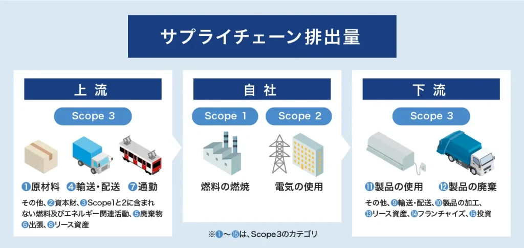 サプライチェーン排出量は「Scope1排出量+Scope2排出量+Scope3排出量」という計算式で表され、各Scopeは以下が該当します。