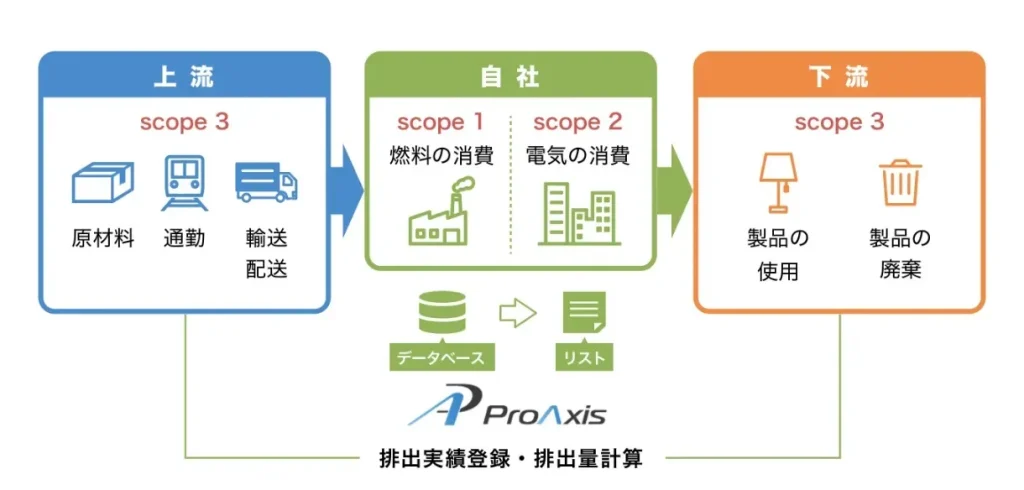 「ProAxis」では、製品の原材料や配送ルートから、生産設備内で排出した温室効果ガス、製品の使用や廃棄にかかる温室効果ガスを、Scopeごとにデータベース化。排出量を登録・集計することで製品に関わる温室効果ガスの種類とその排出量を求めることができます。