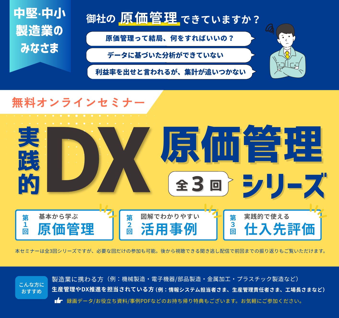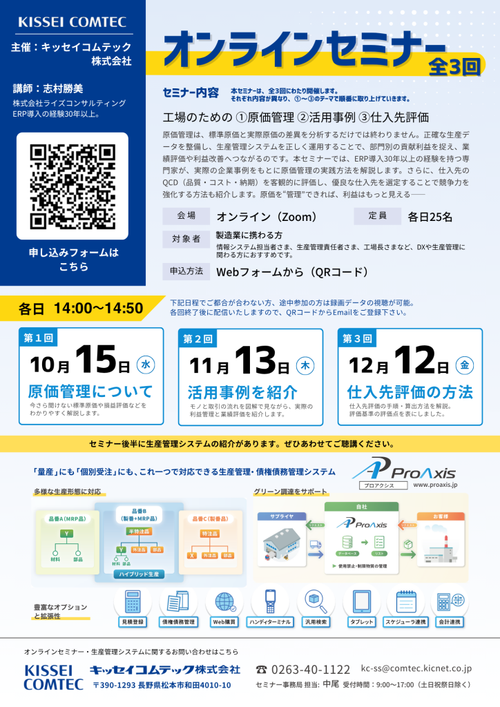 「原価管理セミナー」申込み受付中! 10/15(水) 2025 10/01 2025年10月1日 キッセイコムテック株式会社では「製造業のための原価管理」セミナーを開催します。 申し込みはこちら 詳細は以下のチラシをご覧ください。(※クリックでPDFが開きます) よかったらシェアしてね! URLをコピーしました! URLをコピーしました! 産業フェア in 信州2025 に出展します(10/24,25) 関連記事 産業フェア in 信州2025 に出展します(10/24,25) 2025年9月25日 ホスティングサービスで万全のBCP対策 2025年9月22日 専用保守窓口「i-Support」で安心のサポート体制 2025年9月22日 サポートメンバーを紹介 2025年9月29日 導入の流れ 2025年9月29日 経営判断に必要な情報を迅速に。システム導入で管理視点と体制が整った。―アルプラス株式会社のDX 2025年9月29日 複数の生産拠点を統合管理することで、在庫・納期・コストの”見える化”を実現―長野工業の海外輸出を見据えて 2025年9月29日 4,500種以上の製品を効率的に生産 ― ProAxisで実現したマルミ光機の生産革新 2025年9月29日