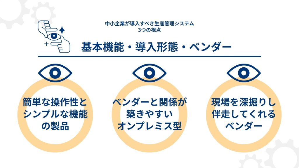 ここでは、中小製造業が導入すべき生産管理システムを、基本機能・導入形態・ベンダーの3つの視点から解説します。